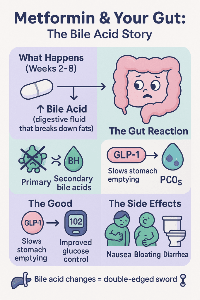 A study in the Journal of Endocrinology found that Metformin alters the ratio of primary to secondary bile acids by inhibiting the bile salt hydrolase activity of certain gut bacteria.(https://pmc.ncbi.nlm.nih.gov/articles/PMC6328020/)